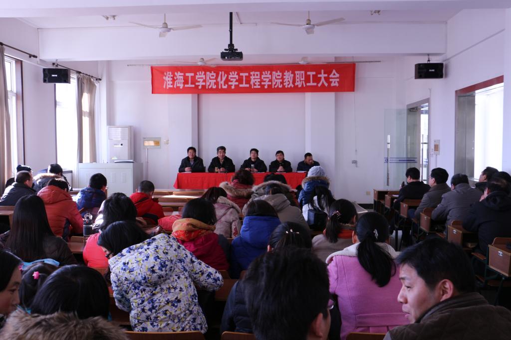 2014年12月31日下午化学工程学院在化工楼会议室召开全院教职工大会。会议由分党委书记钱保华同志主持。会议听取了院长童志伟同志所做的2014年党政工作总结报告和院经费使用报告。院党政领导分别向全体教职工进行了个人年度工作总结报告和述职述廉报告。与会人员还分别对每位院领导进行了干部年度考核民主测评和中层领导干部党风廉政建设情况民主测评。