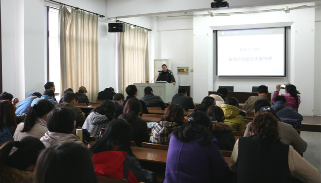 接着,刘新河同志带领全体教职工认真学习了《淮海工学院加强教风建设实施细则》,针对教师的行为规范及基本要求、履行岗位职责及遵守各项规章制度,严格执行教学各环节的质量标准,加强课堂管理,客观公正评价学生成绩,特别是平时成绩要有充分依据。积极参与课外指导,要求教师积极参加教学研究与改革,各系要确保教研活动次数,相互交流与提高教师自身教育教学水平提出了明确的要求。认真学习了《淮海工学院加强学风建设实施细则》,对辅导员、班主任、任课教师及领导班子就学风建设提出了具体而明确的要求。