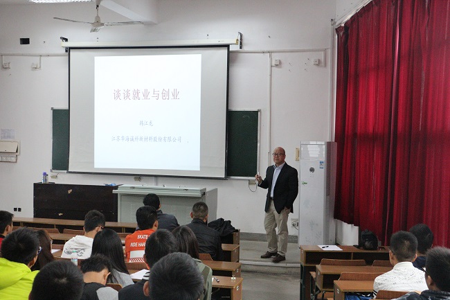 韩江龙,江苏华海诚科新材料股份有限公司董事长兼总经理,连云港华海诚科电子材料有限公司董事长,博士,研究员级高工,国务院特殊津贴专家,“十五国家重大科技专项超大规模集成电路微电子配套材料”总体专家组成员,南京大学兼职教授,常州大学产业教授,江苏省有突出贡献中青年专家,江苏省“333工程”首批中青年科技领军人才, 省“六大人才高峰”优秀人才,省首届“企业博士集聚计划”资助人才,市首届十大杰出青年企业家, 市521第一层次人才。并获省优秀技术开发人员、省技术进步优秀工作者、市技术创新先进个人、市十大经济人物、优秀企业家、劳动模范等荣誉称号。承担完成十多项国家、省重大科技项目,技术水平国内领先,填补国内空白,科研成果多次获省、市科技进步奖励。已申请专利15项,发表学术论文20余篇,是国内外电子封装材料行业知名专家。韩总从企业对大学生的基本要求谈起,向同学们介绍了需要培养的各方面能力和努力的方向;通过几个案例的分析生动形象、深入浅出地阐述了创业的难点及如何创业,并为有创业想法的同学提出了宝贵的建议和指导。