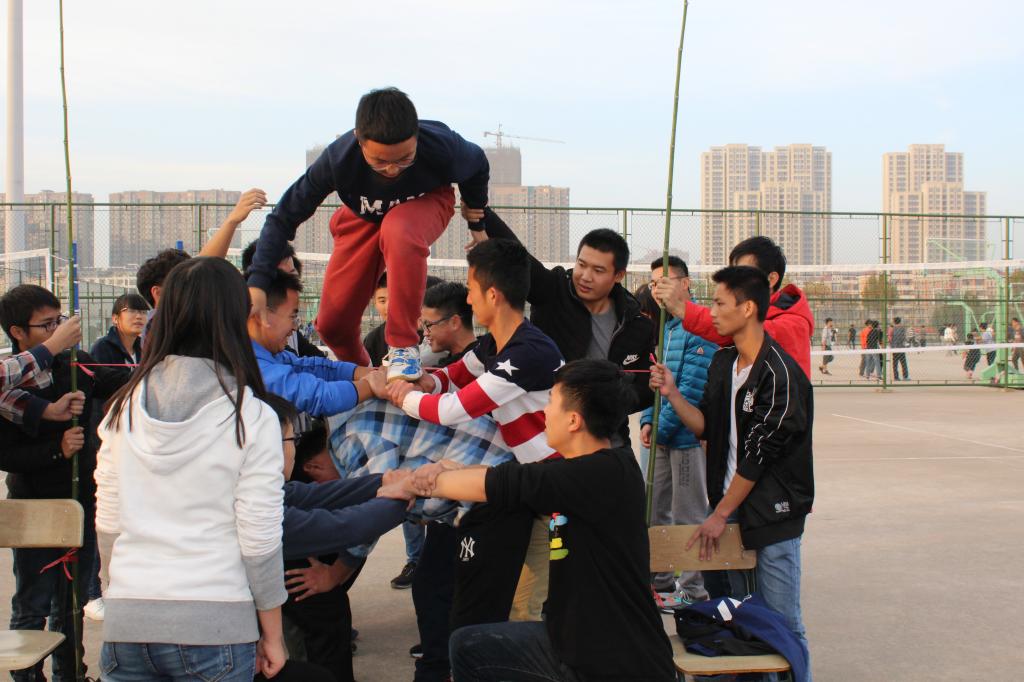 在轻松愉快的背景音乐下,此次活动正式开始。首先,开展的第一个活动是按摩操,全体参与者听着邵世统同学的口令一起了做按摩操,放松身心。按摩操之后便开始了“桃花朵朵开”的游戏,在主持人介绍了游戏规则之后,全体参与者按照所说的数字和队友们抱成团,产生几组落单者。下一个活动名为“一字游戏”,主持人首先为大家示范了一下,然后由上轮游戏的失利者参与这个游戏,他们首先说出一个地点然后加上一个以“一”字开头的成语连成一句话,明白游戏规则的他们脑洞大开,逗得在场的每个人都不亦乐乎。最后的重头戏叫做“抱团打天下”,全体参与者需要从一根悬在1.5米高的细绳上方通过且不能触碰细绳,越过时不允许跳跃,违规则重新开始。一开始,不停的失败、失败,在这样无数次的失败后,游戏几近无法进行。但是,在主持人的鼓励及提醒下,同学们最后想到了搭人梯、空中接力等方式,顺利完成了这个项目。
