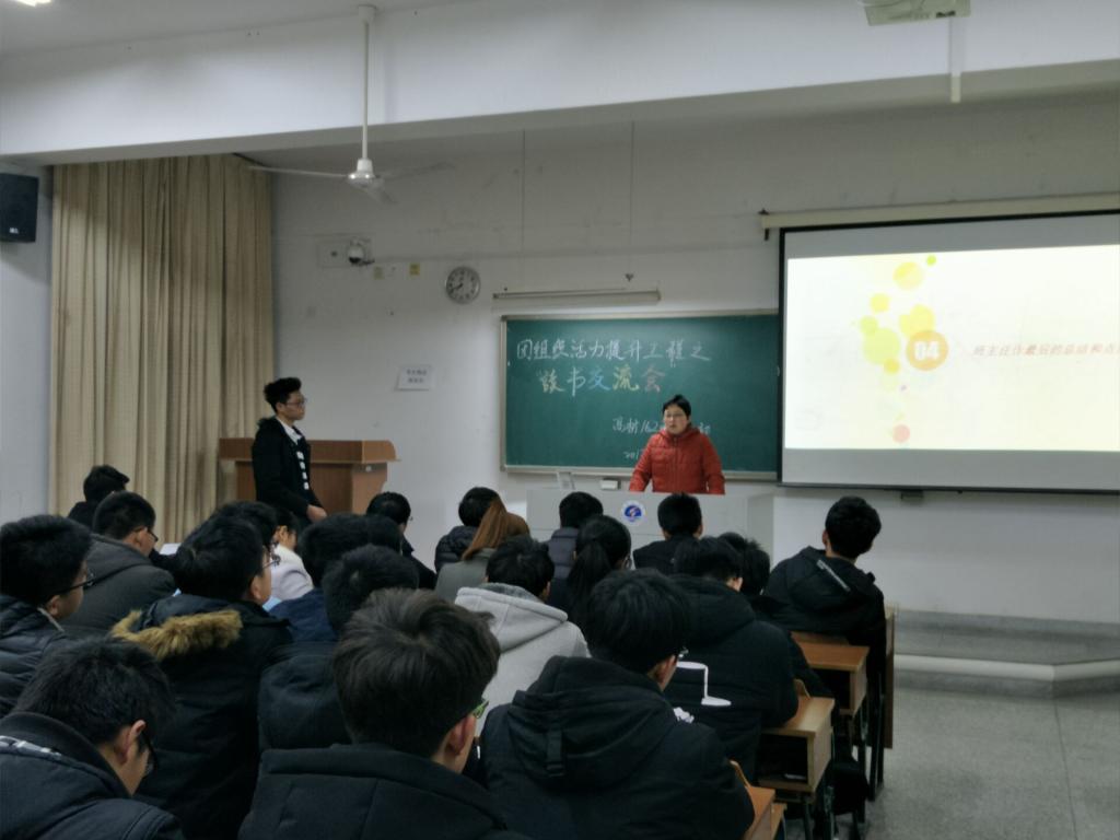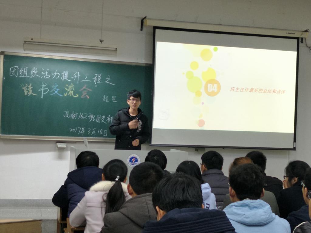 3月10日晚7时许,化学工程学院高分子材料与工程162班于文通楼304室举办了主题为“书香溢满校园,心灵徜徉书海”的读书交流会。班主任李海虹、院团委组织部部长王新出席本次交流会,高材162班全体成员参与,梁晨辉同学担任主讲人。