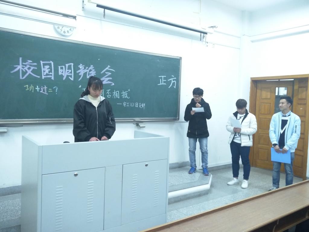 3月19日晚7时,化学工程学院安全工程161班在文通楼309室进行辩题为“功过可否相抵”的校园明辩会活动。团委组织部部长王新作为特邀嘉宾参与本次活动,安全工程161班团支书张傲担任主持人。