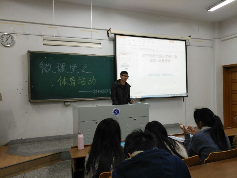 3月19日晚7时,化学工程学院材料工程161班于文通楼305室举办了主题为“体育锻炼”的第四次微课堂活动。本次活动由团支书刘振林主持,体育委员戴加雷主讲,团委组织部部长王新应邀出席此次活动,材料161班全体同学参与。