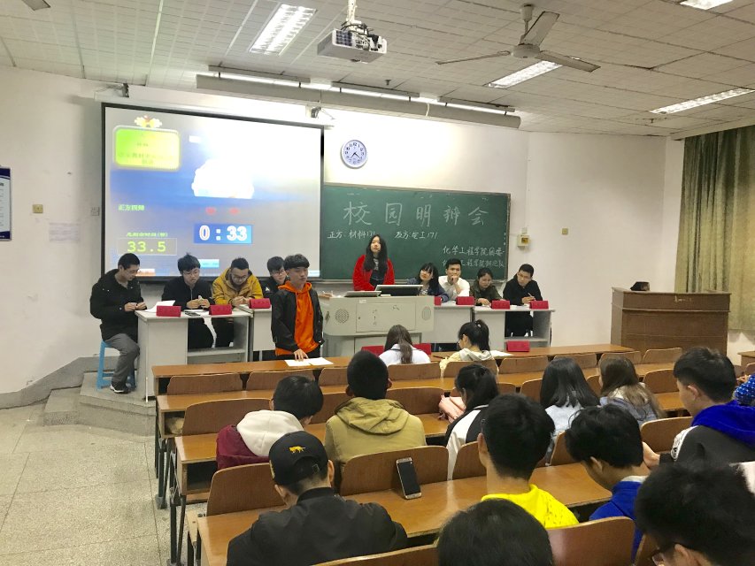 4月1日晚6时30分,化学工程学院团委于主楼112室举办以"为人处事,审时度势和坚守原则哪个更重要"为主题的校园明辩会决赛。学院团总支成员盛德强,邹灵,辩论队领队胡杰飞,队长朱金秋,副队陈高鹏担任评委,队员夏振威担任主席。环工172班、化工171班、化工172班全体同学,学院辩论队部分队员参与本次比赛。