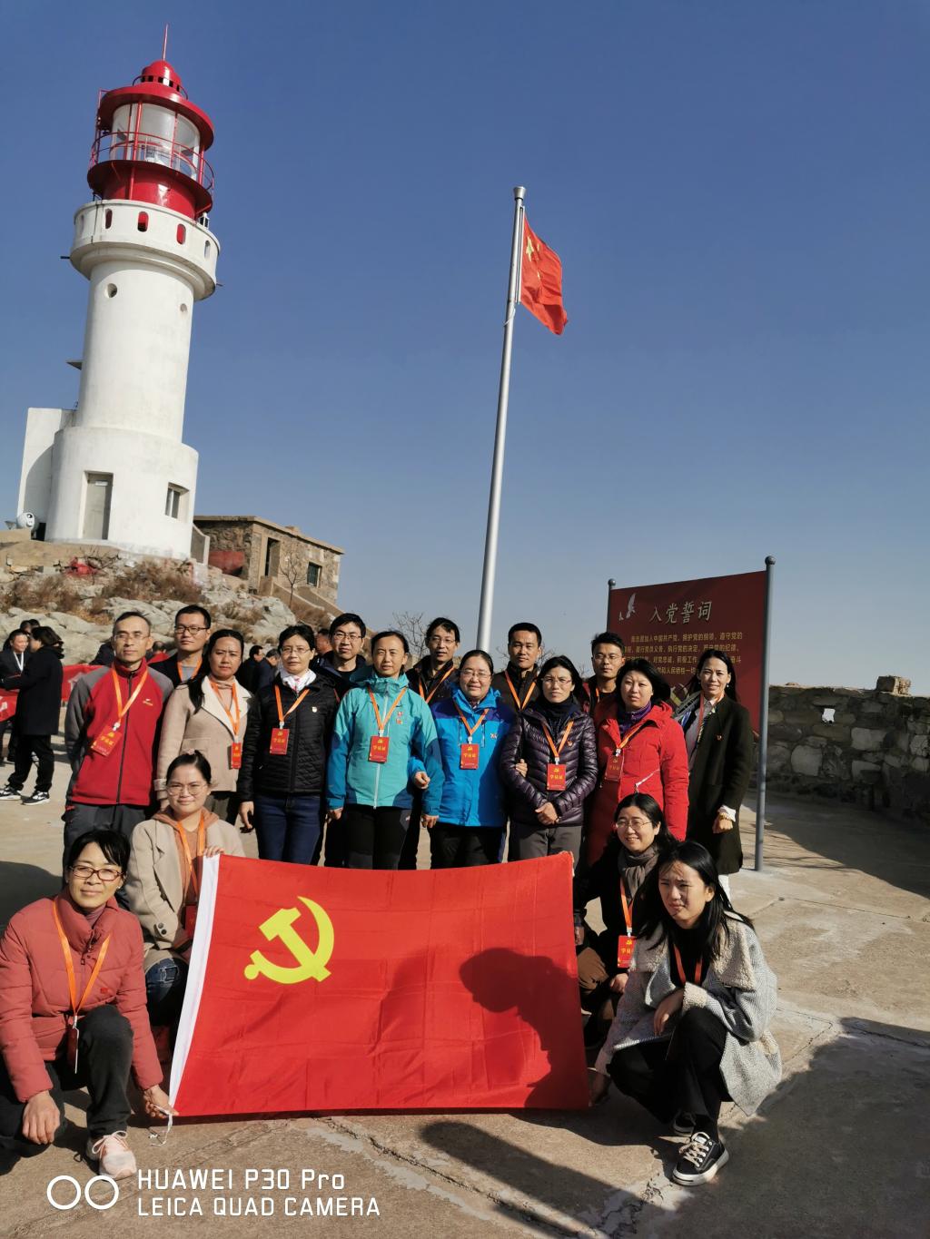 一路上,大家都特别激动,相互交流分享王继才同志各种先进事迹和感人事件,尤其是上船以后,师生站在甲板上凝视着远方,任凭海风吹乱头发,在海面上体验着王继才同志32年来的各种艰辛和不易。还没上岛师生就将党旗、院旗和支部的旗拿出来以支部为单位在甲板上合影留念。大家挥动着手喊道:“开山岛,我们来了!”