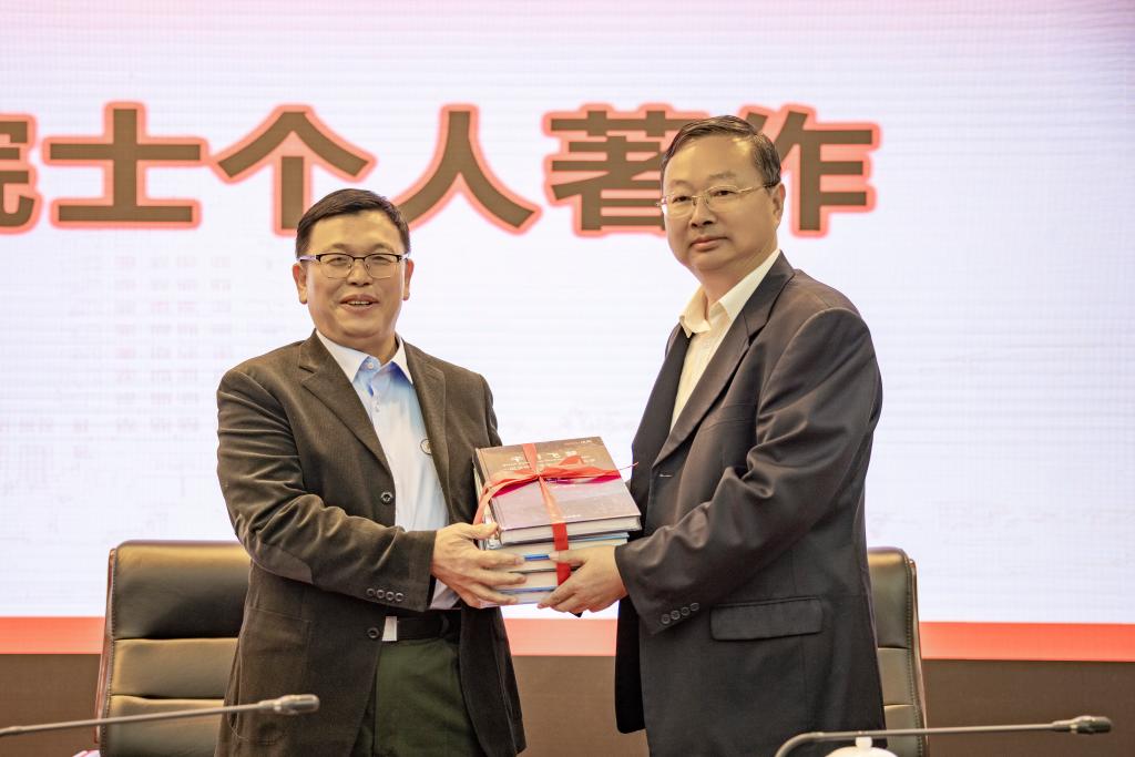 报告会开始前,宁晓明为胡文祥院士颁发客座教授证书,胡院士向学校捐赠个人著作。