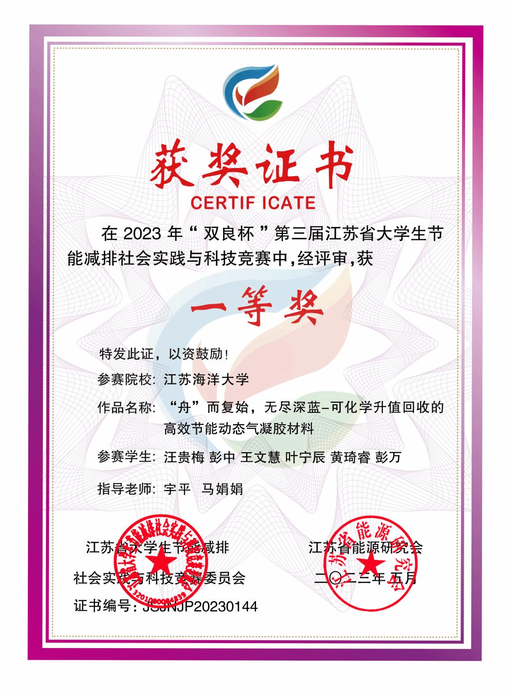 我院由宇平、马娟娟两位老师指导,汪贵梅同学负责的作品《“舟”而复始,无尽深蓝—可化学升值回收的高效节能动态气凝胶材料》荣获一等奖,由夏明、赵新辉两位老师指导,苏朋月同学负责的《一种多应用场景的海洋漂浮垃圾回收装置》和李瑞光老师指导,吕进同学负责的《海洋清洁者—高弹性石墨烯纳米纤维素复合气凝胶》分别荣获二等奖,学校荣获大赛“优秀组织奖”。