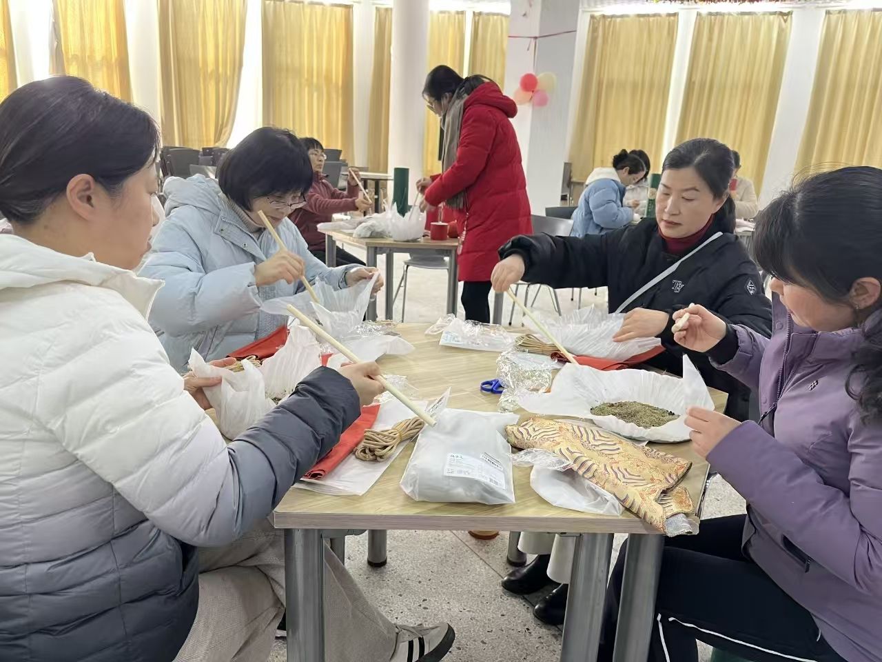 在中药艾草锤DIY 制作环节,大家纷纷动手,将散发着清新香气的艾草仔细整理,用棉布紧紧包裹,再将麻绳精心缠绕,制作出一个个独具匠心的艾草锤。在制作过程中,教职工们相互交流、分享经验,现场欢声笑语不断,弥漫着浓厚的节日氛围。