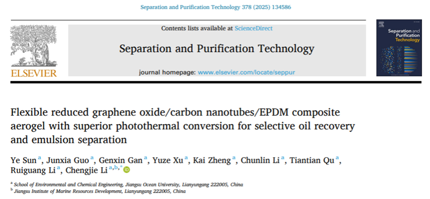 近日,江苏海洋大学环境与化学工程学院学子在工程技术TOP期刊Separation and Purification Technology上发表研究论文“Flexible Reduced Graphene Oxide/Carbon Nanotubes/EPDM Composite Aerogel with Superior Photothermal Conversion for Selective Oil Recovery and Emulsion Separation”(2025,DOI:10.1016/j.seppur.2025.134586)。学院本科生孙叶为第一作者,研究生郭俊瑕等为论文共同作者,李成杰副教授为通讯作者。