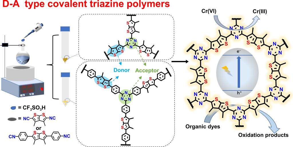 耿吴越同学先后在Separation and Purification Technology(10.1016/j.seppur.2022.120829),Microporous and Mesoporous Materials(10.1016/j.micromeso.2021.111186)上报道了关于D-A型共价三嗪聚合物和共价有机框架作为高效光/电功能材料的论文。作者首先设计合成两种供体-受体型共价三嗪聚合物(CTP)用做水体中Cr(VI)还原的高效光催化剂。研究表明,所设计的聚合物可以在不使用任何牺牲剂、氧化剂或附加酸的情况下同时去除Cr(VI)和有机污染物。此外,通过简单的一锅溶剂热法将TPA-COF(TPA=三苯胺)与炭黑(CB)复合制备了系列复合修饰电极材料。炭黑的引入不仅提高了复合材料的导电性,而且提高了复合材料的比表面积。基于这些优点,TPA-COF/CB复合材料被开发为新型电极修饰材料,用于多巴胺(DA)的电化学测定。在最佳条件下,所构建的修饰电极表现出20 - 1000 μM的线性检测范围和17 nM的检出限(S/N=3)。