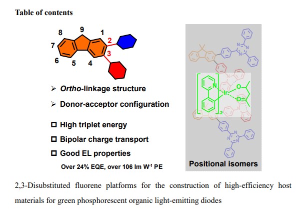 魏佳佳同学在Chemistry A European J(中科院2区期刊,IF 5.236)报道了以9,9-二甲基芴为核心以其C2-、C3-位点构建的四种双极型主体材料,通过研究其热化学性质、光化学性质、电化学性质以及电致发光性能,发现该类材料具有较好的磷光主体材料的性能。不寻常的2,3-二取代芴可以被视为一种失谐连接策略,它创造了扭曲的分子构象,这种扭曲的三维空间结构赋予它们良好的热性能和较高的ET值。由这四种分子制备的器件均具有绿色磷光,并且都展现出了较好的效率以及较平滑的效率滚降。在这四款设备中,G1具有最高的功率效率,其PE值已经超过了106 lm W-1。此外,G2和G3也具有较高的功率效率,均已超过了100 lm W-1。这些结果进一步拓展了芴衍生物用于高效OLED材料的可能性。