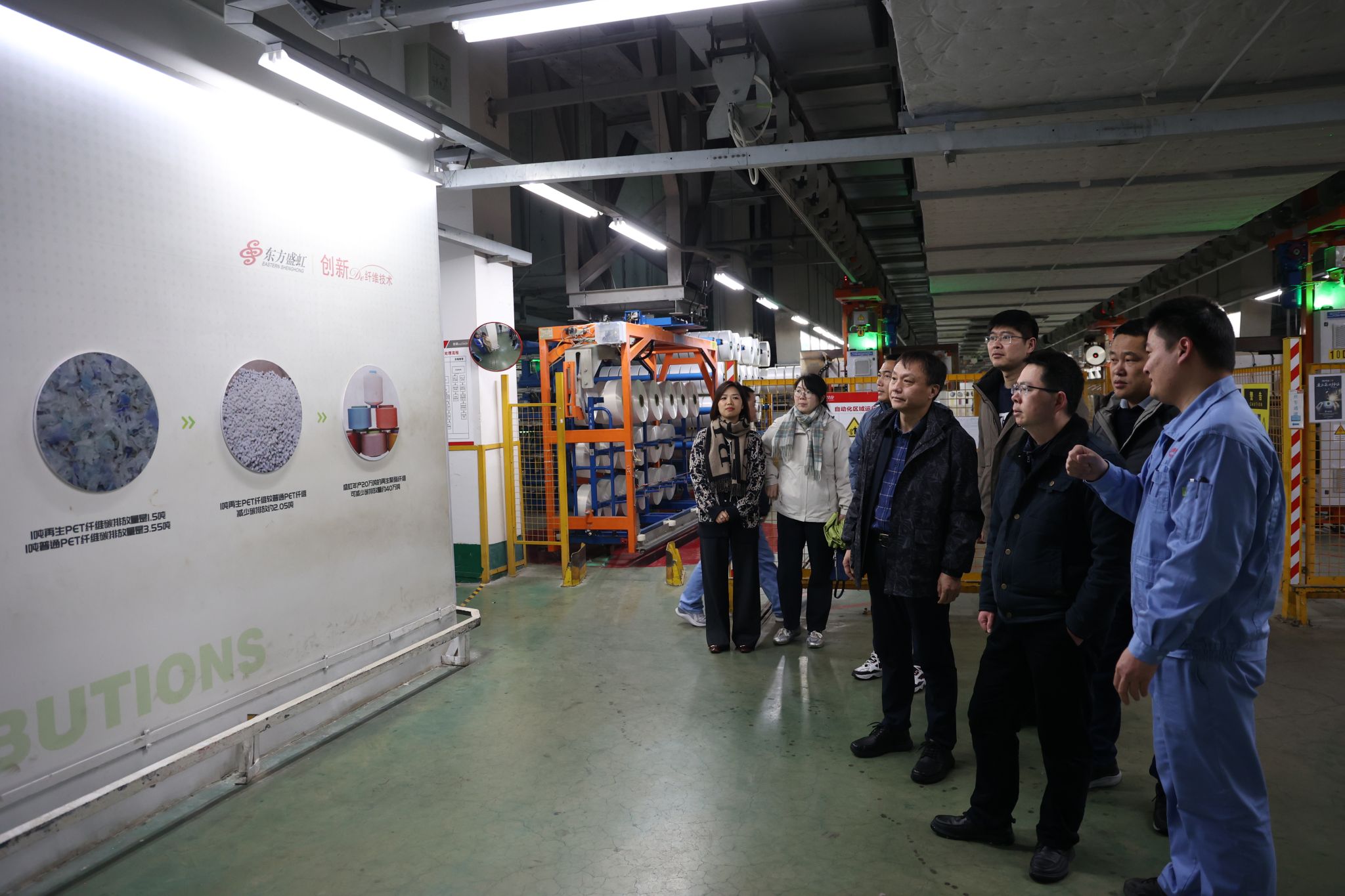 1月26日,调研团队首站抵达盛虹控股集团。团队参观了江苏国望高科纤维有限公司的功能性纤维智能化生产车间、国家先进功能纤维创新中心研发实验室,深入了解企业在高端聚烯烃、电子化学品、先进功能纤维等前沿领域的技术突破与产业布局。座谈会上,双方围绕绿色化工工艺开发、智能工厂运维人才培养、高性能纤维材料创新等议题展开讨论。学院领导表示,盛虹在新能源新材料领域的自主创新实践为相关学科建设与人才培养提供了重要参照,希望双方共同在推动科研攻关、实习基地共建等方面开展务实合作。