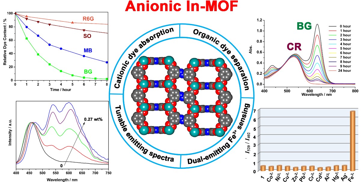 金属有机框架材料(MOFs)是由有机配体连接金属离子(簇)形成的多孔材料,其结构可在分子原子层次进行设计,在气体吸附、分离、催化等领域表现出了广泛应用前景。近年来,对MOFs结构的功能化研究受到科学家们的广泛关注。其中,离子型MOFs因其特殊电荷分布,使其表现出独特的功能特性。本工作中,该团队通过选用三价铟离子与羧酸配体自组装制备了2例具有负电性框架的MOFs,将其成功运用于有机染料的吸附和分离。同时,研究发现,该类离子型MOFs可用做白光荧光材料,并能实现三价铁离子的选择性识别。相关内容对今后设计合成多功能MOFs材料具有一定参考价值。