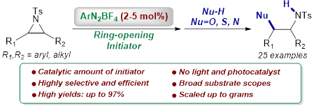 1.Aryldiazonium ion initiated C–N bond cleavage for the versatile, efficient and regioselective ring opening of aziridines, Org. Chem. Front., 2019, 6, 1832。该文报道了一种芳基重氮盐引发氮丙环选择性开环反应的新策略,与多种亲核试剂作用生成含氮分子化合物,反应在室温中进行,开环过程对各种亲核试剂(包括[O]、[S]和[N])均高效适用。这一高度区域选择性的过程,可以实现克级合成,具有操作简单,条件温和、无金属的条件。初步的机理研究发现,反应可能以自由基方式开环。