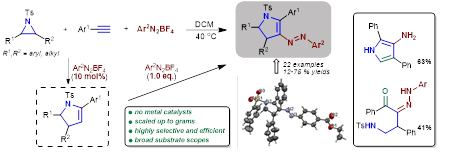 2.Metal-free cascade reactions of aziridines with arylalkynes and aryldiazoniums: facile access to arylazopyrrolines, Org. Biomol. Chem., 2020, 18, 3149. 该文在前期研究工作基础上,使用氮丙环、芳基末端炔与芳基四氟硼酸重氮盐为反应底物,经过三组分串联反应,高效、精准的构建了4-(芳基二氮烯基)-2,3-二氢吡咯衍生物。该方法不使用金属,反应条件温和,简便易行,可实现克级合成。鉴于偶氮化合物广泛应用于材料科学和有机合成,如染料、传感器、纺织品和催化剂配体等,方法将在化工和纺织等领域有重要意义。