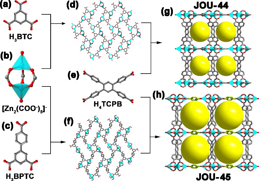 4. 通过网状化学策略,使用溶剂热法合成了系列阴离子型MOF(JOU-11、JOU-12、JOU-23、JOU-44和JOU-45)。结构分析表明这几例MOF都呈现出三维阴离子骨架和高孔隙率,它们被开发用于有机染料的吸附和分离。此外,由于荧光配体的引入,JOU-11、JOU-12和JOU-23还被开发为荧光探针材料用于金属离子和硝基化合物的选择性识别。相关工作发表在Inorganic Chemistry, 2021, 60, 167-174、CrystEngComm, 2021, 23, 3319和Journal of solid state chemistry, 2021, 302, 122424。