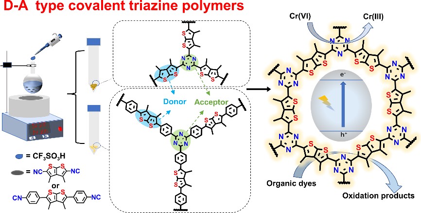 1. 通过引入不同D-A单元新设计四例聚合物光催化剂用于水中Cr(VI)还原和有机污染物降解。实验表明,独特的D-A型分子结构可以更有效的促进光诱导电荷分离。另外发现,在D-A中心引入共轭基团能够进一步提升电荷的空间分离效果,增强催化剂的光催化活性。相关工作发表在Separation and Purification Technology, 2022, 290, 120829和Journal of Solid State Chemistry, 2022, 310, 123004。