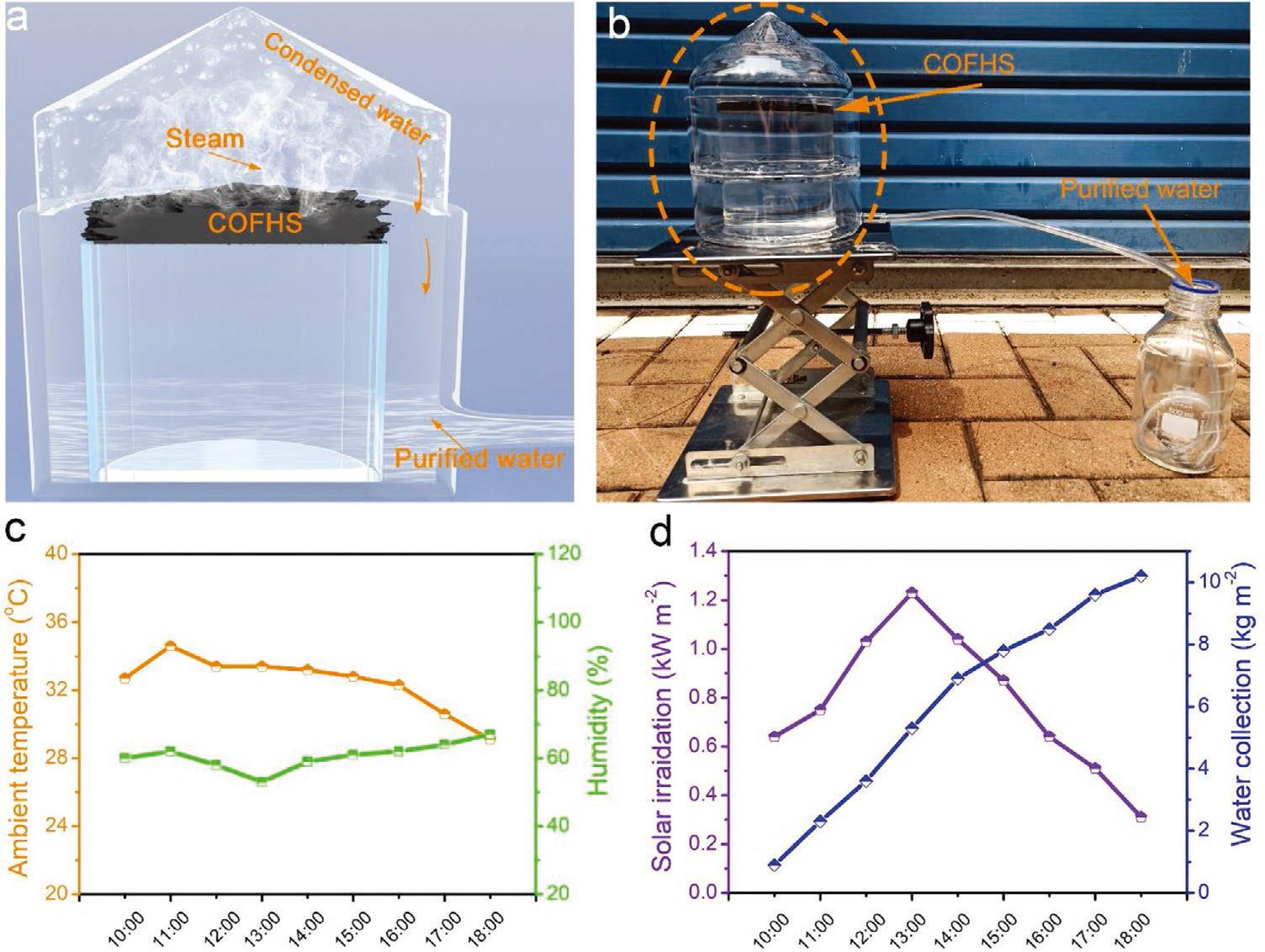 3. 成功构筑一例基于二酮吡咯的二维共价有机骨架(COF),在此基础上制备了3D多级结构水蒸发器用于太阳能驱动海水蒸发。由于该结构表现出紫外-可见-近红外的宽光谱吸收优势,所制备的蒸发器显示出较高的太阳能-蒸汽能量转换效率,可以实现自然光驱动下10.2 L m-2d-1的水收集速率,使COFHS成为一个具有潜在应用前景的利用太阳能生产清洁水平台。本工作是首次将COF材料用于太阳能-热能转换驱动水蒸发。相关工作发表在Small Methods, 2021, 5, 2100036。