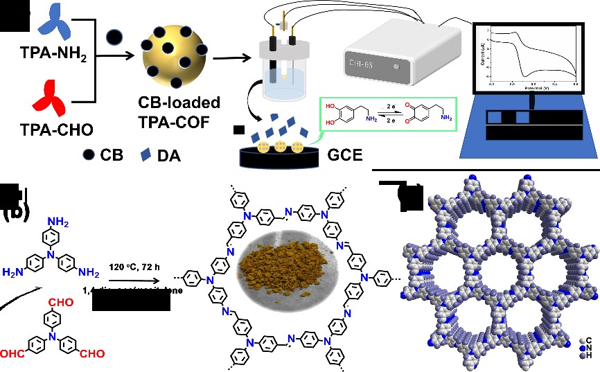2. 针对单一COF材料导电性不足的问题,通过简单的一锅溶剂热法将TPA-COF与炭黑复合制备了系列复合修饰电极材料。TPA优异的氧化还原能力使复合材料具有优异的电化学活性。炭黑的引入不仅提高了复合材料导电性,而且提高了复合材料的比表面积。基于这些优点,TPA-COF/CB复合材料被开发为电极修饰材料用于多巴胺的电化学测定。此外,所构建的修饰电极被成功用于商用多巴胺注射液中DA浓度的检测。相关工作发表在Microporous and Mesoporous Materials, 2021, 323, 111186。