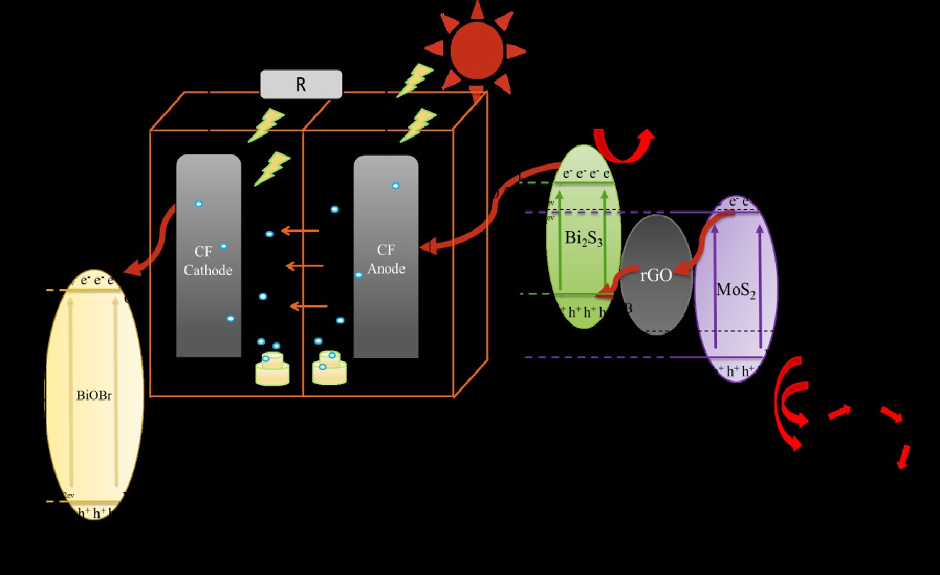 1. Construction of a photocatalytic fuel cell using a novel Z-scheme MoS2/rGO/Bi2S3as electrode degraded antibiotic wastewater, Separation and Purification Technology, 2021, 277, 119276.文章以Z-scheme型MoS2/rGO/Bi2S3的三元复合材料作为阳极,构建光催化燃料电池系统,成功实现了对两类热点抗生素类水体污染物盐酸四环素及盐酸小檗碱的高效降解,通过简单的水热合成方法制得材料,在节能环保的同时,实现污染物降解并产电。
