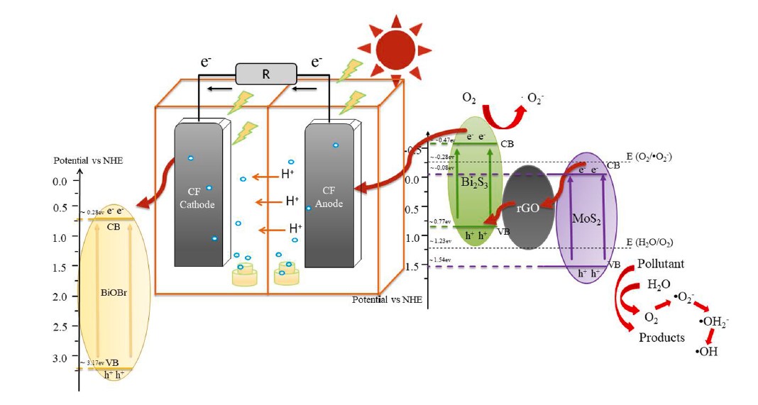 刘青松同学先后在Separation and Purification Technology(10.1016/j.seppur.2021.119276)和International Journal of Hydrogen Energy(10.1016/j.ijhydene.2021.11.021)期刊上发表研究论文两篇。作者采用水热合成法制备了负载在碳毡上的三元异质结复合材料,并结合光催化燃料电池系统对常见的两类有机污染物(盐酸小檗碱、盐酸四环素)进行了降解实验。探究了三元异质结中的电子传递机制,分析了有机污染物的降解过程。为三元异质结构复合催化剂在有机污染物降解方面的应用提供了新思路。