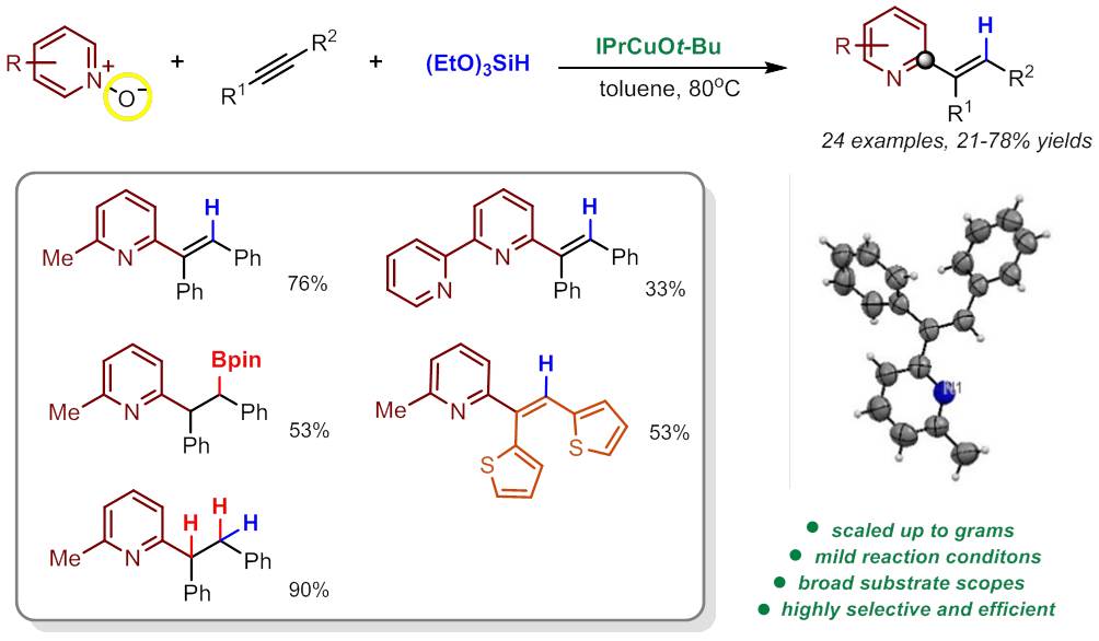 王树霞同学在Chemical Communications(中科院2区期刊,IF 6.222)报道了铜催化吡啶-N-氧化物的烯基化反应,研究使用卡宾铜作为催化剂,催化吡啶-N-氧化物、炔烃和硅烷发生烯基化反应,成功合成了2-烯基吡啶类化合物。反应首先是硅烷和卡宾铜生成铜氢试剂,随后炔烃对铜氢试剂进行迁移插入反应,生成烯基铜中间体,吡啶-N-氧化物捕获中间体烯基铜试剂,合成了多种2-烯基吡啶衍生物;该方法反应条件温和,底物适用性广,区域选择性好;烯基吡啶作为一种重要合成砌块,是合成药物和天然产物等复杂分子的重要中间体,因此本研究将在有机合成、医药、农用化学品等领域有重要意义。