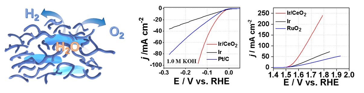 徐凯同学在Chemical Communications(中科院2区期刊,IF 6.222)报道了铱纳米棒直接生长在多孔的氧化铈表面,以提高催化剂的析氢和析氧性能。氢气具有能量密度大、反应碳零排放的天然优势,是碳中和愿景下最理想的清洁能源之一,必将成为能源体系重要组成部分。电解水属绿氢工艺,操作简单、碳零排放,为产氢行业发展之必然趋势。电解水的电极反应传统上采用贵金属催化材料,受到成本和储量的限制,长期以来,贵金属的利用率和催化活性一直是材料和能源领域关注的重点研究课题。徐凯同学通过多次的实验论证,发现载体对贵金属的分散度和稳定性具有至关重要的作用。并且,载体元素的外层原子轨道和贵金属元素的外层原子轨道之间会通过杂化导致价电子的离域化作用,可以改变贵金属对水分解反应中间产物的吸附强度。这个细微的变化会进一步降低水分解反应活化能垒,降低水分解过电位,减少电能消耗。为了实现上述目标,徐凯同学将铱纳米棒直接生长在多孔的氧化铈表面,该催化剂的析氢和析氧性能较纯铱有明显的提高。此外,徐凯同学还详细研究了铱纳米棒的载量、形貌对催化性能的影响。相关工作发表在国际权威期刊Chemical Communications, 2021, 57, 8798-8801。这种电子协同作用构筑金属-金属氧化物界面的方法也可以应用于其他Ir基催化剂和其他贵金属催化剂中,以提高贵金属催化剂的利用率和催化活性。