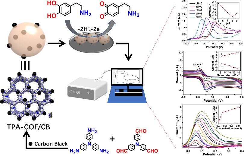 耿吴越同学先后在Separation and Purification Technology(10.1016/j.seppur.2022.120829),Microporous and Mesoporous Materials(10.1016/j.micromeso.2021.111186)上报道了关于D-A型共价三嗪聚合物和共价有机框架作为高效光/电功能材料的论文。作者首先设计合成两种供体-受体型共价三嗪聚合物(CTP)用做水体中Cr(VI)还原的高效光催化剂。研究表明,所设计的聚合物可以在不使用任何牺牲剂、氧化剂或附加酸的情况下同时去除Cr(VI)和有机污染物。此外,通过简单的一锅溶剂热法将TPA-COF(TPA=三苯胺)与炭黑(CB)复合制备了系列复合修饰电极材料。炭黑的引入不仅提高了复合材料的导电性,而且提高了复合材料的比表面积。基于这些优点,TPA-COF/CB复合材料被开发为新型电极修饰材料,用于多巴胺(DA)的电化学测定。在最佳条件下,所构建的修饰电极表现出20 - 1000 μM的线性检测范围和17 nM的检出限(S/N=3)。