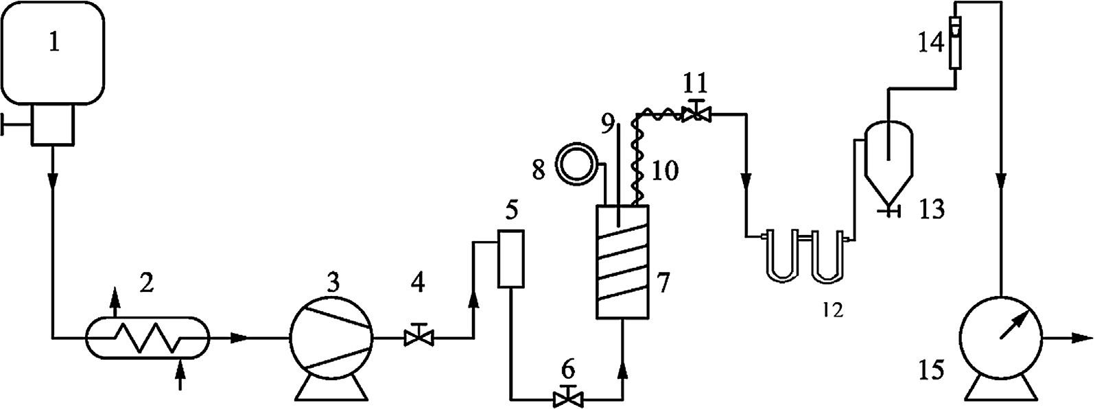Fig. 1. Schematic diagram of the static experimental apparatus. 1, R134a cylinder; 2, refrigerator; 3, syringe pump;4, inlet valve; 5, buffer; 6, outlet valve; 7, equilibrium cell; 8, pressure gauge; 9, resistance thermometer; 10, flexible heating coil; 11, decompression valve; 12, U-shape tubes; 13, surge flask; 14, rotated flow meter; 15, wet-gas flow meter.