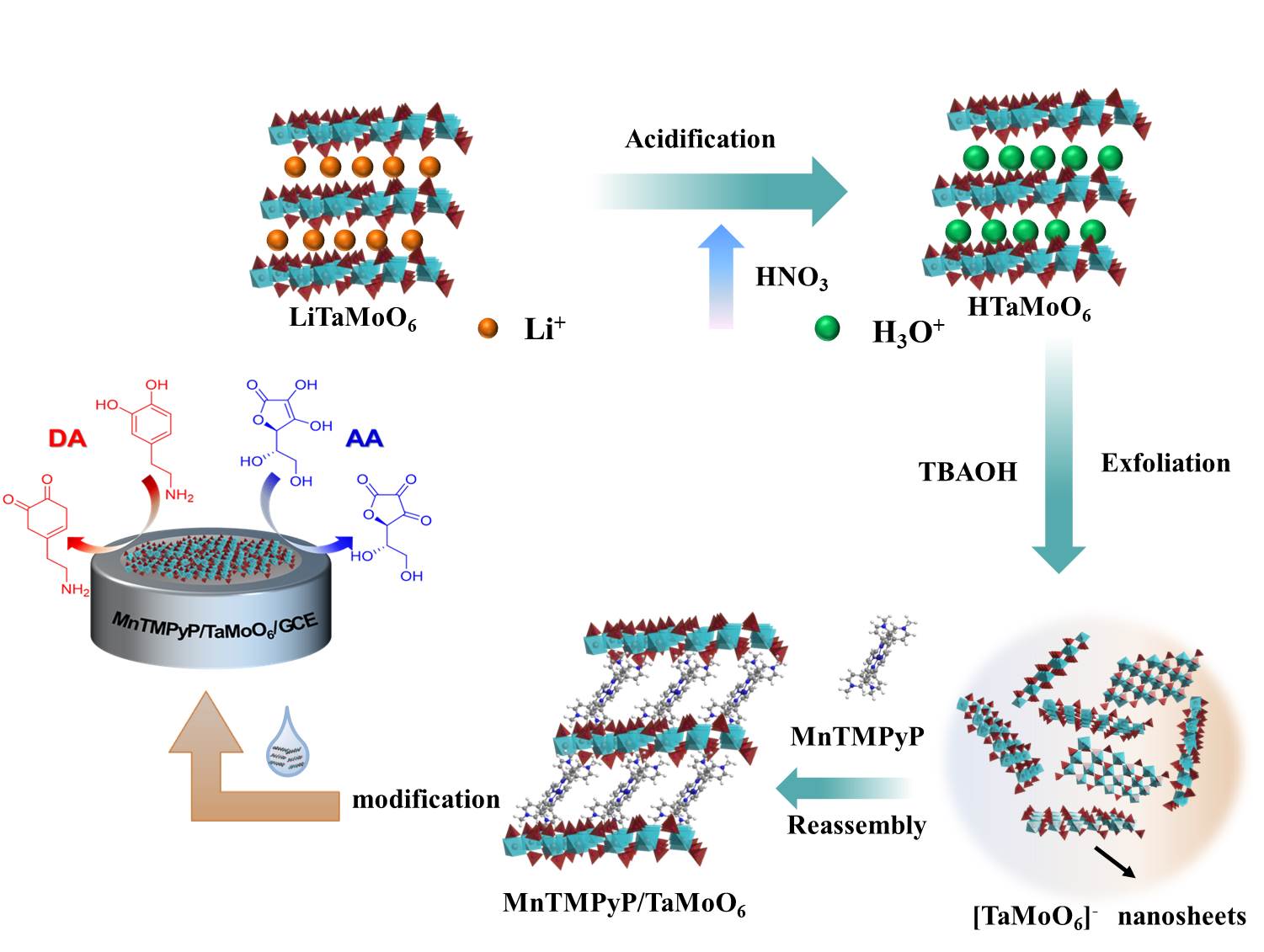 MnTMPyP/TaMoO6纳米复合材料的制备流程示意图以及在多巴胺和抗坏血酸检测中的应用