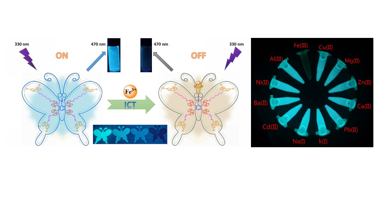 邱粟玉同学在Dyes and Pigments(中科院2区期刊,IF=4.889)报道了一种基于氰基咔唑的封装型热激活延迟荧光传感器BrACCN。以经典的分子结构4CzCN作为发光核,并对其逐步封装优化光物理性质,实现长的延迟荧光寿命长和高荧光量子产率。通过研究和分析,支枝探针的荧光量子产率为73%,是未封装结构4CzCN的1.5倍。基于外围Br原子的引入,探针BrACCN的荧光寿命增加了一倍,为3 μs。同时,该探针对Fe3+离子具有较高的选择性和灵敏度。在多种离子存在的情况下,探针只对Fe3+的络合模式为1:1的荧光关闭。该探针对Fe3+离子的检测限较低,为2.9×10-8mol/L。该探针还具有较强的AIE特性,这对该探针的应用范围非常有利。相比较于传统型短寿命荧光探针,该TADF型探针的优良性能将在活细胞共聚焦荧光成像和时间分辨荧光成像中提供广阔的应用前景。