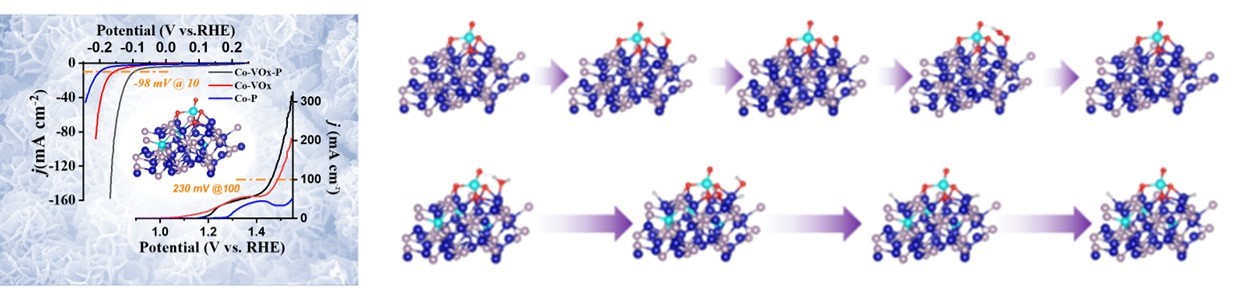 朱自政同学在Applied Catalysis B: Environmental(中科院1区Top期刊,IF=19.503)报道了钴-钒体系中引入磷以实现d电子结构和能量状态最优化的研究成果。我国碱性电解水制氢已具备大规模推广的产业基础,其迅速崛起为制氢行业发展之必然趋势。过渡金属成本和储量优势显著,最有望成为丰富的低成本催化材料来源。如何提高过渡金属基催化材料的性能,降低电能消耗一直是科学界和产业界关注的重大科学问题。当两种过渡金属原子形成合金时,一方面在电负性差异的作用下,左侧元素的价层电子会进入到右侧元素的原子轨道,另一方面在广义Lewis acid-base作用下,左侧元素原子的空轨道会吸纳右侧元素的价层电子。即元素周期表上不同位置的元素之间的外层电子会发生流动,并且这种流动会受到非金属元素的调控。朱自政同学的研究表明,在钴-钒体系中引入磷,可以实现d电子结构和能量状态的最优化。该同学通过大量的实验研究,所合成的自生长型钴-钒-磷催化体系,仅需要98 mV的超小过电势就达到10 mA/cm2的析氢电流,仅需要230 mV的超小电势就获得100 mA/cm2的析氧电流。该实验结果与DFT的模拟计算结果高度吻合。该研究所提出的非金属参与调控d电子双向流动策略有望用于其他过渡金属催化体系的优化设计。相关成果发表在国际权威期刊Applied Catalysis B: Environmental, 304 (2022) 120985(IF=19.503)。