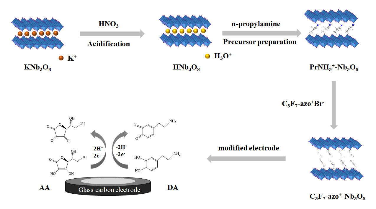 C3F7-azo+-Nb3O8纳米复合材料的制备流程示意图以及在抗坏血酸和多巴胺检测中的应用