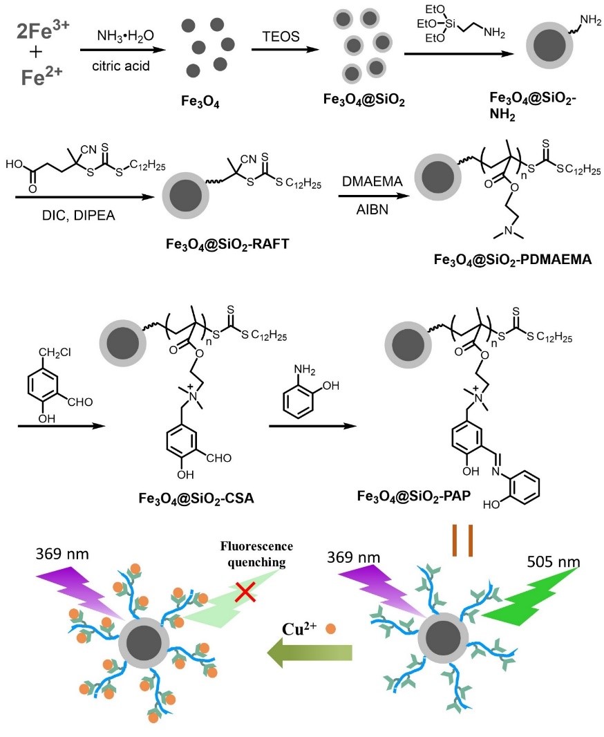 朱涛同学在Applied Surface Science(中科院1区期刊,IF=7.392)报道了一种季铵盐水杨醛希夫碱侧链聚合物接枝的磁性吸附剂Fe3O4@SiO2-PAP,该材料通过表面引发可逆加成-断裂链转移聚合方法,将结构规整的聚合物链接枝到磁性Fe3O4纳米粒子表面,具有良好的水分散性和磁力回收性能。通过系统的吸附实验,发现Fe3O4@SiO2-PAP对Cu2+的吸附容量为59.98 mg/g,吸附过程自发进行,符合Langmuir等温模型和拟二级动力学模型,属于受化学控制的单分子层吸附。同时,Fe3O4@SiO2-PAP对Cu2+具有荧光猝灭响应,且具有较高的选择性和灵敏度,在其它金属离子存在时并不影响对Cu2+的识别,通过Lineweaver Burk模型和Stern-Volmer模型分析,发现猝灭属于静态猝灭,对Cu2+的检测限为8.0 µg/L。最后通过理论计算分析,证实了Fe3O4@SiO2-PAP用于Cu2+去除和检测的可行性。
