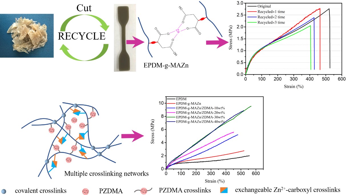 EPDM-g-MAZn重复加工及EPDM-g-MAZn/ZDMA交联网络示意图
