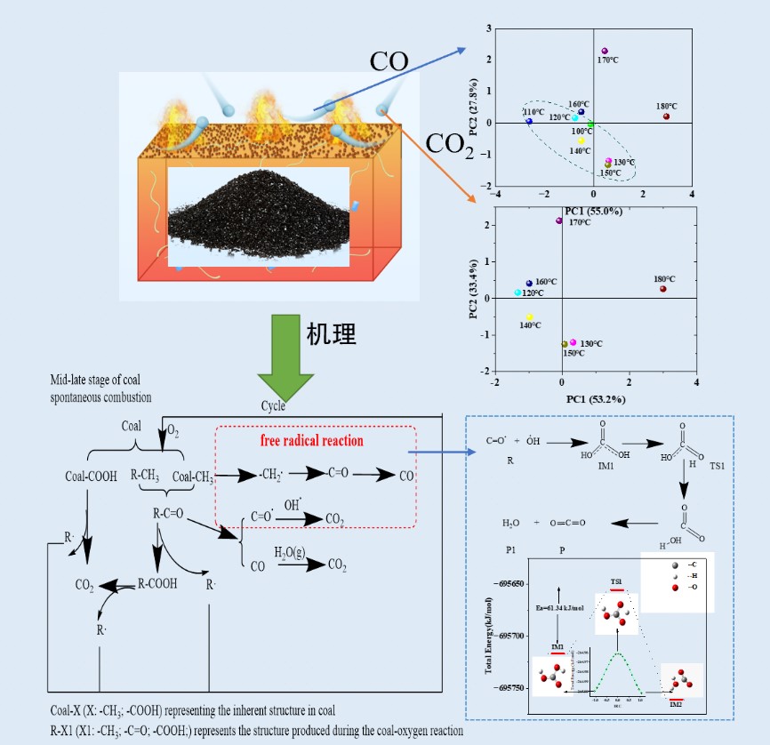 作者采用主成分分析(PCA)、Pearson线性分析与傅里叶红外光谱分析相结合的方法,对不同变质程度煤,在低温氧化过程中三种活性官能团-CH3、-C=O、-COOH相对含量,与CO、CO2产生规律的相关性进行研究,结果表明不同变质程度煤CO、CO2生成机制亦不相同。其中低变质程度煤产生的CO、CO2主要源于固有,以及次生烷基侧链不断形成和持续氧化;中等变质程度煤主要源于含氧官能团的氧化;对于高变质程度煤CO主要源于煤中烷基侧链氧化生成羰基,羰基断裂后所形成,少部分源于煤-氧自由基反应。而CO2来源则较为复杂。最后文章还通过量子化学计算方法对C=O·与·OH自由基反应机理进行研究,结果表明该自由基反应在一定条件下即可自发进行,并放出一定的热量,从而对煤自燃过程起到积极促进作用。文章系统地研究了煤中含氧官能团、烷基侧链与氧反应机制,探究煤中活性基团含量与指标性气体CO、CO2浓度之间相互变化关系,其研究成果对揭示煤自燃复杂机理具有重要意义。