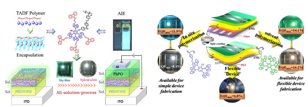 周涛同学先后在Chemical Engineering Journal(中科院1区期刊,IF=16.744)、ACS Applied Materials & Interfaces(中科院2区期刊,IF=10.383)和Journal of Materials Chemistry C(中科院2区期刊,IF=8.067)期刊上发表研究论文4篇。作者采用简单、经济且不需要贵金属催化剂的方法将苯腈类TADF单元嵌入非共轭大分子或聚合物侧链上,得到了一系列光、热、电等性能优异的TADF聚合物,并采用溶液法制备了红、绿、蓝电致发光器件。其中,以P4CzCN-PA作为主体,5TCzBN为发射体的绿色OLEDs实现了52.0 cd A-1和20.9 %的最大光度效率和外量子效率,可与真空沉积器件相媲美。基于新设计的封装型聚集诱导TADF聚合物,溶液处理的OLEDs对于天蓝和白色器件分别达到11.5%和13.0%的最大外量子效率,这是所报道的聚合物OLEDs中的最高效率之一。此外,作者还提出了单分子Exciplex的概念,化合物PhTRZ-CzTPA在薄膜状态下表现出与单体物理混合物相同的发射光谱,充分证明了本体异质结的可行性,刷新了Exciplex只能是混合物的认知。最后,鉴于聚合物高密的网络结构,通过引入红色掺杂剂,成功制备了首个基于聚合物TADF的柔性可弯曲OLEDs。上述合成工艺简单、性能优良的苯腈类TADF聚合物对于开发用于高性能溶液处理和柔性器件的有机发光二极管具有重要的指导意义。