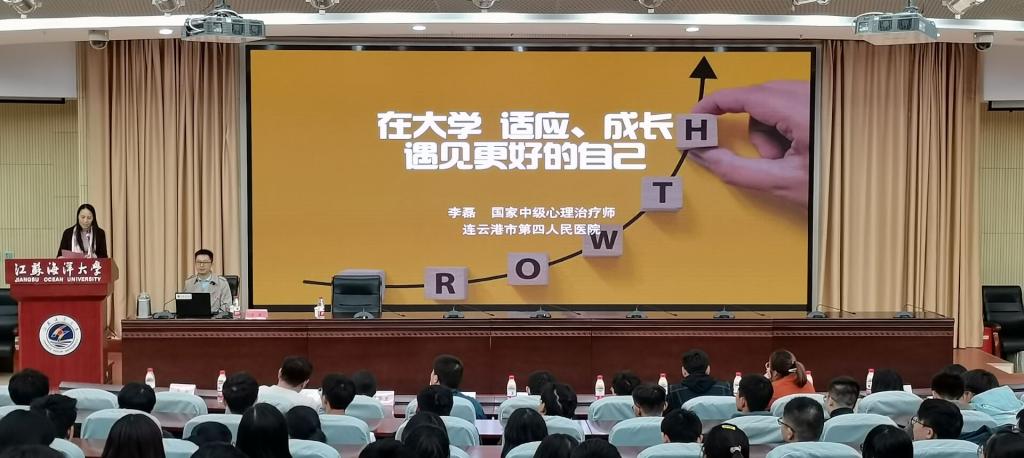 11月10日晚18时30分,江苏海洋大学学生处邀请国家中级心理治疗师、连云港市第四人民医院主任李磊在会议中心黄海厅为环境与化学工程学院新生开展以“在大学,适应、成长,遇见更好的自己”为主题的心理健康教育讲座。学院党委副书记王改红、新生班主任与全体辅导员出席讲座,学院全体新生参加讲座。