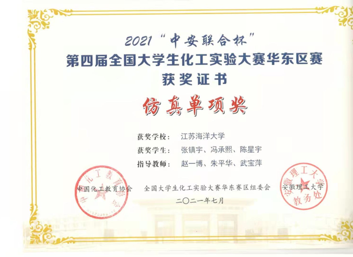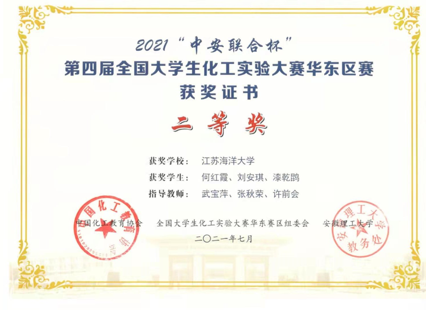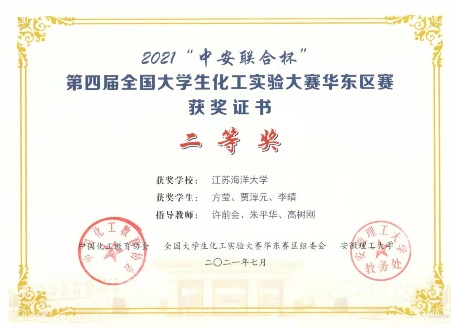 2021年7月22至25日,“中安联合杯”第四届全国大学生化工实验大赛华东区赛在安徽理工大学隆重举办,来自上海、江苏、浙江、安徽、江西等4省1市53所高校的125支队伍参赛,创历届大赛规模之最。江苏海洋大学环境与化学工程学院派出3支队伍共9名学生参赛,许前会、武宝萍、朱平华、张秋荣、高树刚、赵一博等担任指导教师。经过激烈角逐,获团队二等奖2项、仿真单项奖1项。