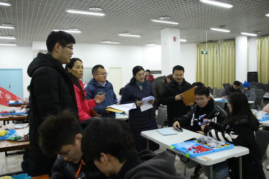 大赛伊始,朱小明致词,他预祝本次比赛取得圆满成功,参赛选手们能获得自己理想的成绩,并希望参赛选手们对分子结构的理解能更上一层楼。紧接着,主持人宣布比赛正式开始。本场比赛共有17组选手参加。他们在赛场上运用自身的化学知识储备来动手搭建不同的分子模型。同时,评委们也时刻关注着赛场上选手们的进度,以公正严谨的态度为选手们打分,并不时地询问选手分子模型的构造以及选择这类模型的原因。赛程过半,选手们陆续完成了他们的作品。评委老师针对他们的作品进行提问,在确定选手们对分子模型的了解程度和完成模型的用时后,评委老师给予各组选手最终评分,并为还没有完成模型的小组加油。