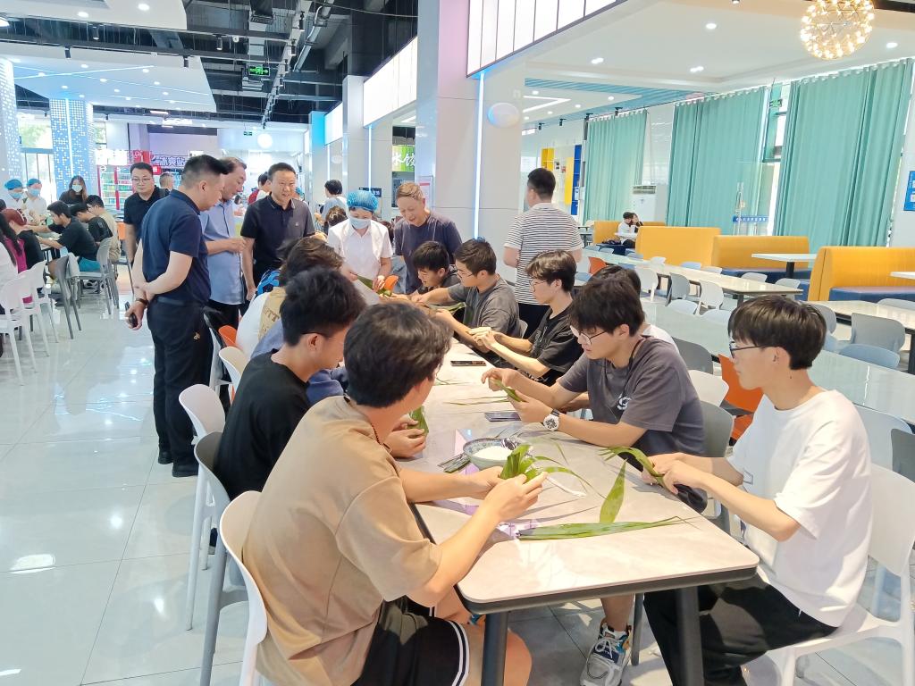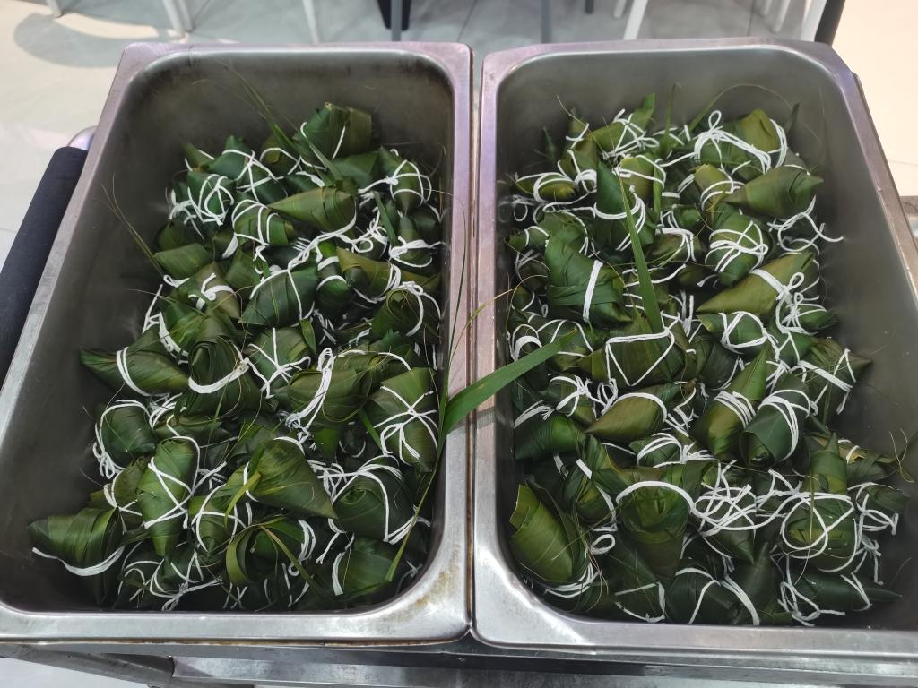 参加活动的同学们,有的经验丰富,有的现学现做。刚开始,大家包出来的粽子奇形怪状,但在老师和食堂工作人员的帮助下,同学们很快就掌握了包粽子的方法,卷粽叶、填蜜枣、包粽米、系粽绳......每个环节都做得有模有样,活动现场欢声笑语不断,大家一边包粽子一边交流端午节传统习俗,体验着包粽子的乐趣。