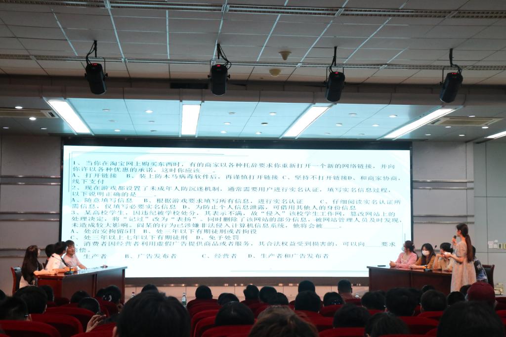 活动现场首先进行安全知识竞赛决赛。安全知识竞赛的内容丰富广泛,包括消防安全、交通安全、食品安全、人身安全、网络安全、国家安全、心理健康以及防范网络诈骗等大学生应知应会的各类安全知识。比赛激烈且富有挑战性,决赛由化工代表队和安工代表队进行角逐,最终安工代表队凭借在抢答题环节出色表现,问鼎冠军。