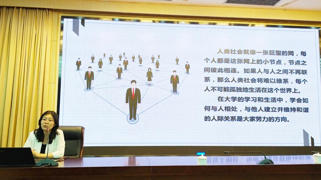 “对于大学期间的人际关系,你的期待是?”讲座伊始,蒋老师以“新生入学情况小调查”为切入点,引入讲座主题——人际交往。蒋老师解释道:由于高中环境到大学环境的变化,大学生往往因人际交往而产生心理健康问题。她从人际边界与人际沟通两个方面展开讲座内容。讲座期间,蒋老师与同学们积极互动,在引导同学们进行思考的同时,结合自身生活经历与感悟,让同学们切实体会到人际交往的重要性。蒋老师强调:一是要尊重他人的边界,把握好交往尺度,为自己与他人提供一个舒适的个人空间;二是要积极沟通,在沟通中获得理解和支持,维护好良好的人际关系。