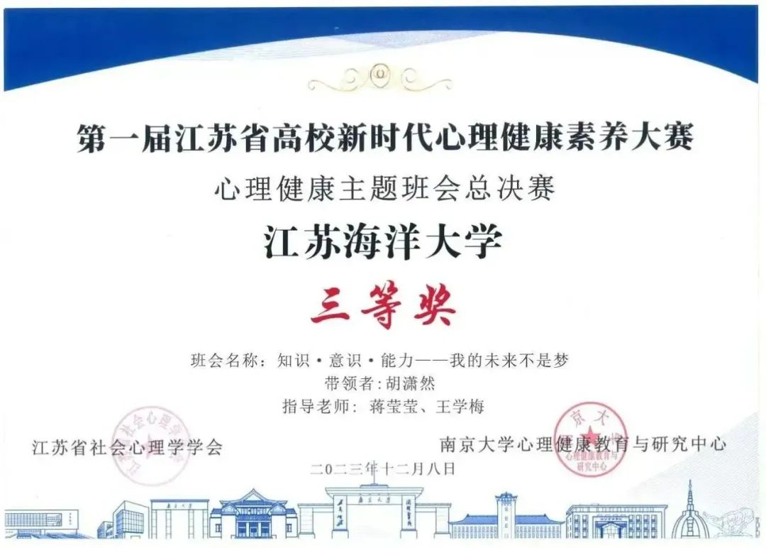 近日,第一届江苏省高校新时代心理健康素养大赛决赛在南京大学举行,大赛由江苏省社会心理学学会、南京大学心理健康教育与研究中心共同主办。在校心理中心指导下,我院心理健康主题班会作品荣获省赛三等奖。