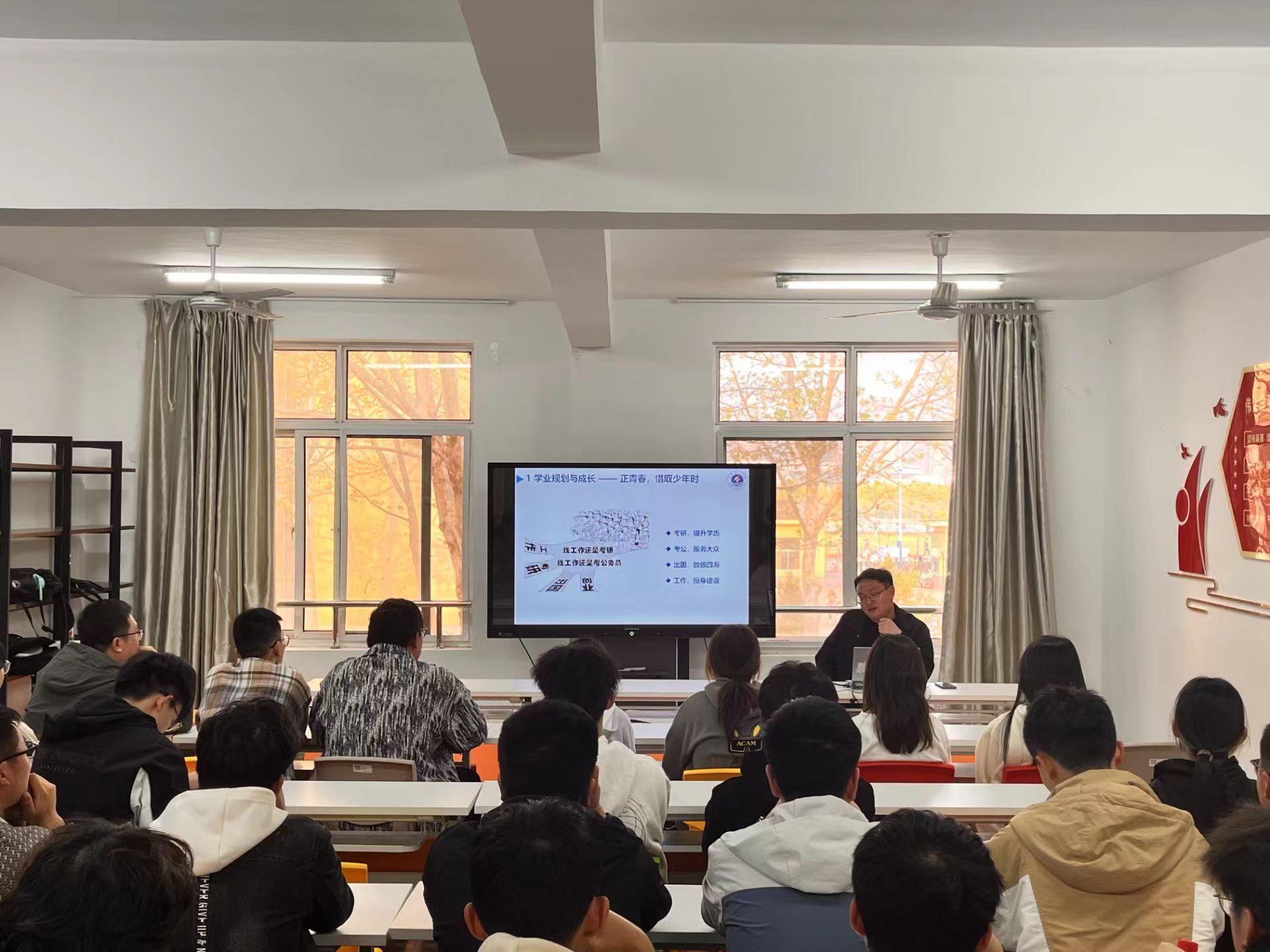 活动中,杨校毅老师结合鲜活的案例讲述了生涯规划的相关策略和正确处理心理压力的方法,要求同学们在专业学习和学生组织工作等方面做好平衡,及时调整压力。公丕成老师分享了自身的大学经历以及备战考研的艰苦历程,并针对同学们最常见的一些困惑给予解答,鼓励同学们积极的面对压力与挑战,超越自我,追求卓越! 在互动环节,“老师,我现在的压力就有点调整不过来,各种事情都堆在一起没法好好的处理,怎么办呢?”“老师,您对独善其身的理解是什么?”……同学们一一抛出困扰自己的问题,老师们逐一进行耐心解答,活动现场响起阵阵热烈的掌声!