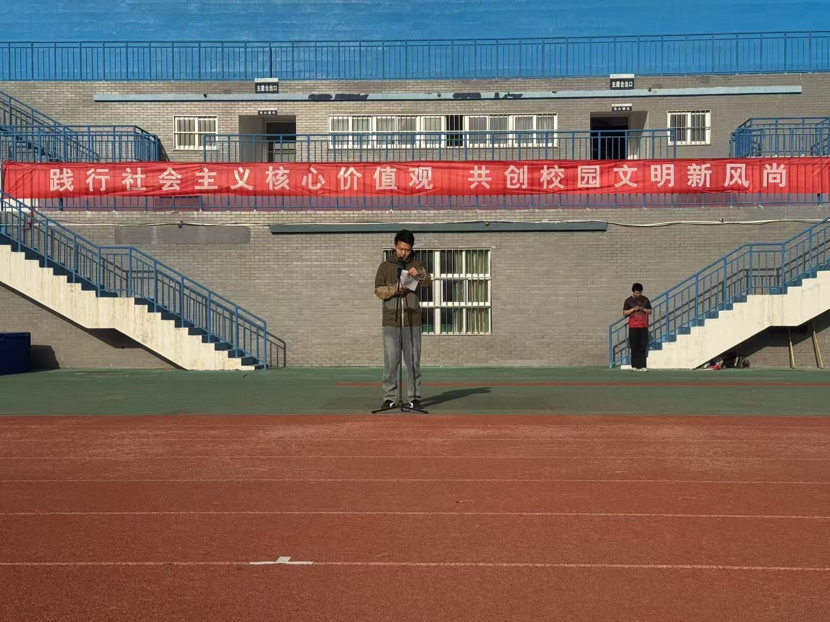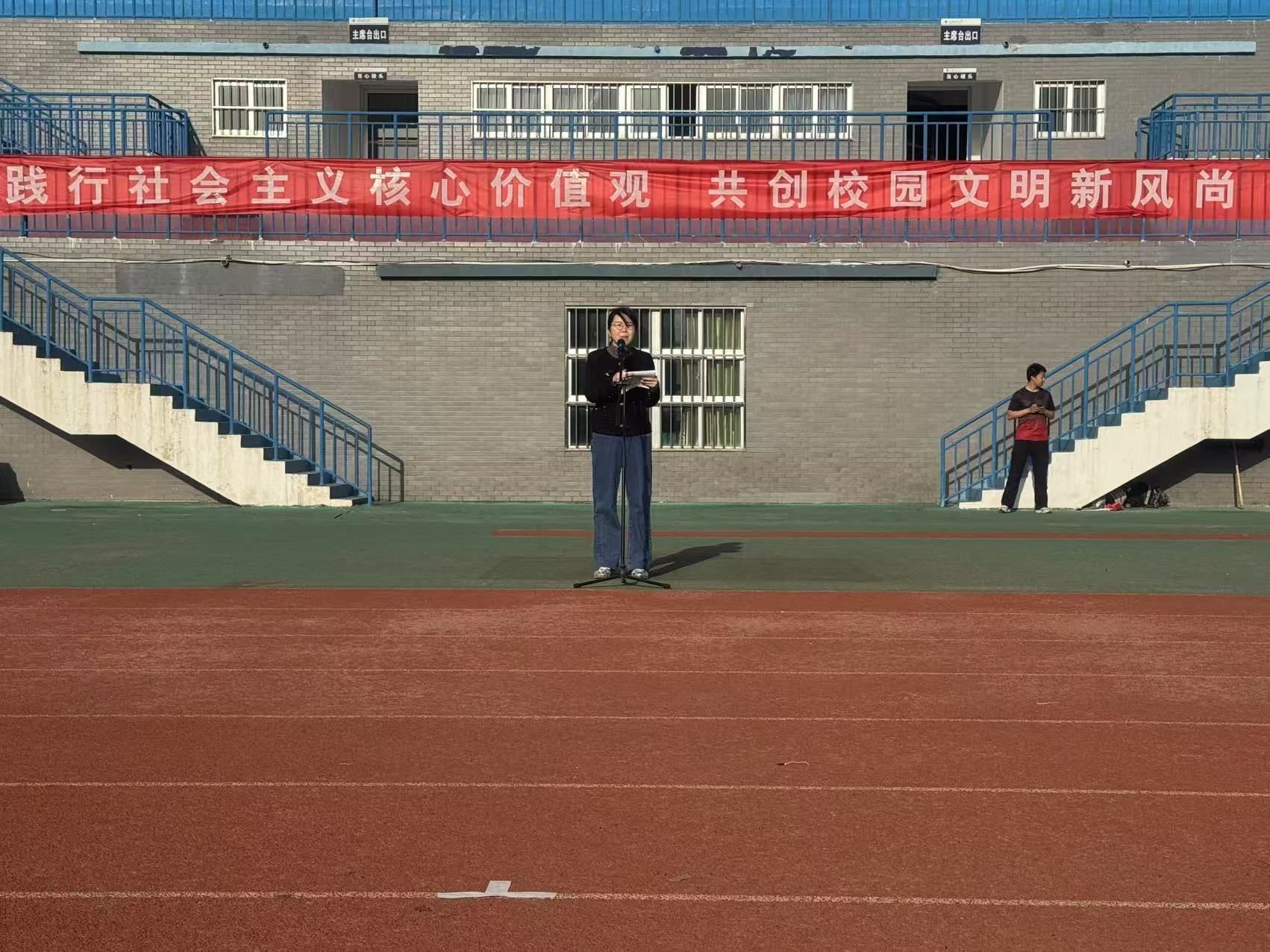 学院党委副书记王静讲话,她强调了践行社会主义核心价值观对青年和国家的重要意义,希望环化学子将其内化为精神追求,外化为实际行动。接着,她围绕学风建设通报了各班级近期出勤及学业通过率等数据,强调2025 年学院各班级学风建设目标为提升学业和四级通过率。她希望同学们以升旗仪式为契机,将社会主义核心价值观教育与校园文明建设紧密结合,在实践中推动社会主义核心价值观教育落地生根,营造文明和谐校园新风尚。