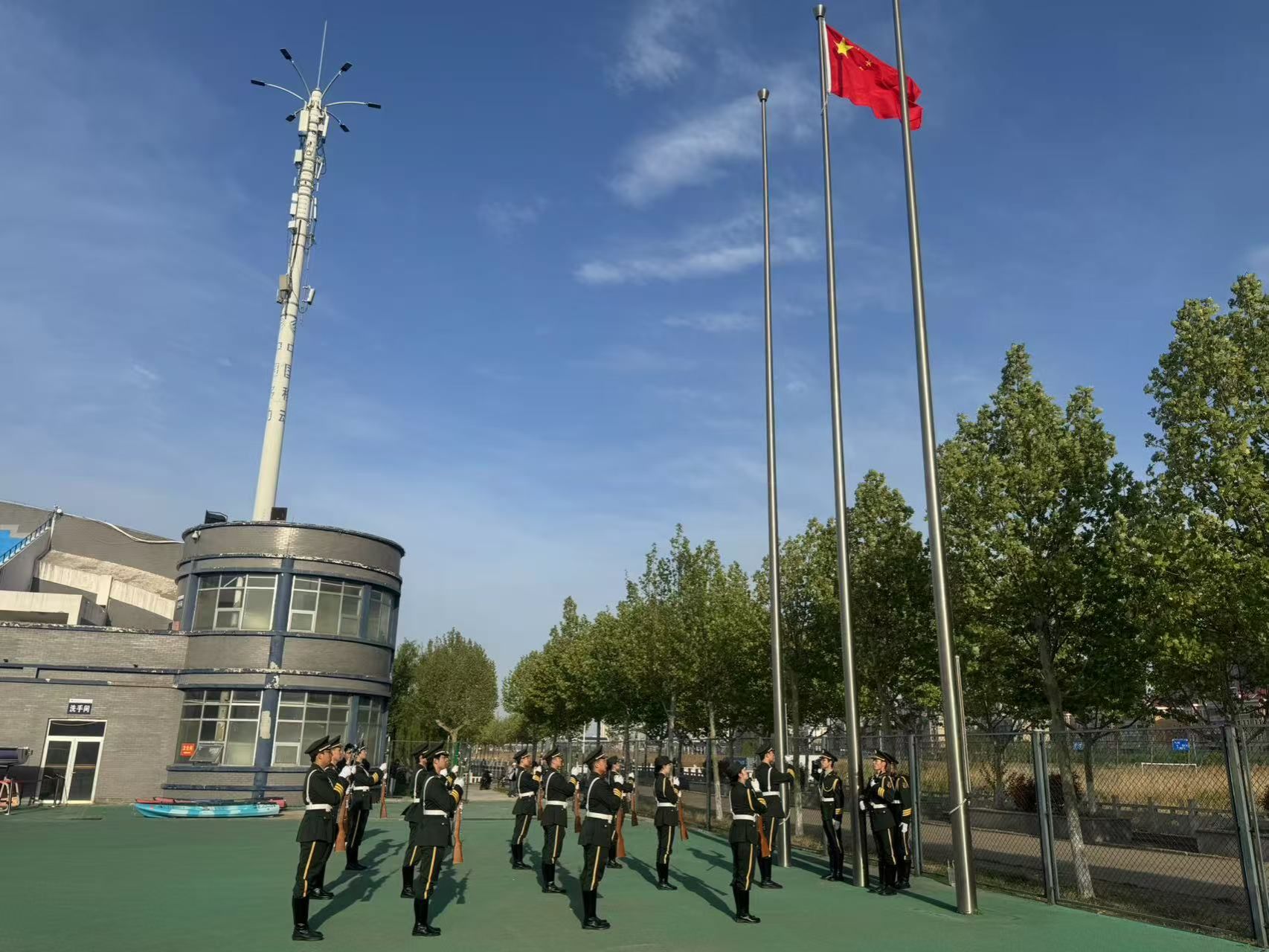 七点整,伴随着庄严的国歌,鲜艳的五星红旗冉冉升起。全体师生肃立致敬,奏唱国歌。