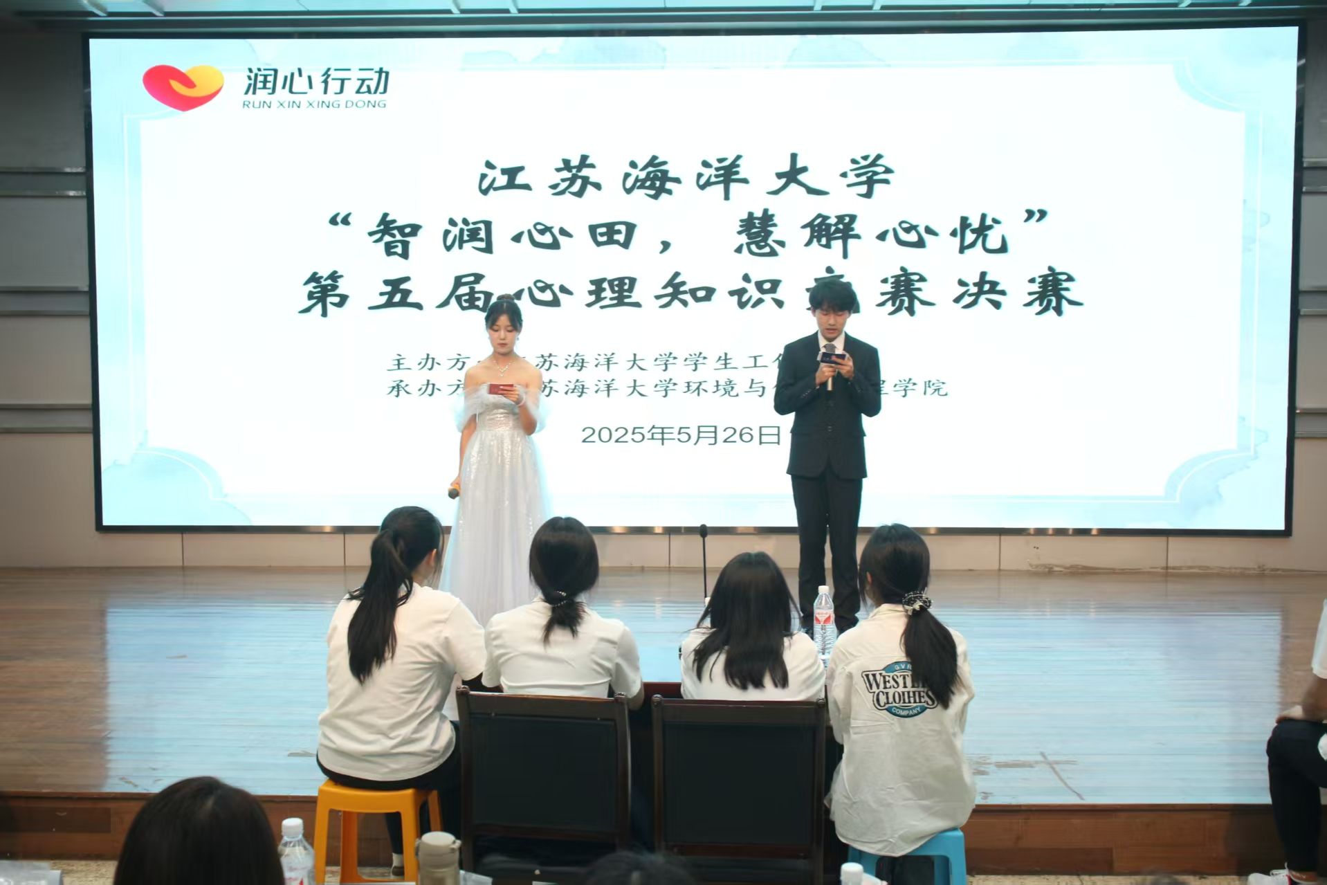 为进一步加强大学生心理健康教育引导,切实将心理健康教育融入德智体美劳全过程,促进学生全面发展,5月26日晚,由江苏海洋大学大学生心理中心主办,环境与化学工程学院承办“智润心田,慧解心忧——江苏海洋大学第五届心理知识竞赛”在艺术楼报告厅顺利举办。校心理中心老师解如华,环境与化学工程学院党委副书记王静,辅导员苏成兄、徐虎林,程艺,大学生心理互助中心主席李杰出席活动。