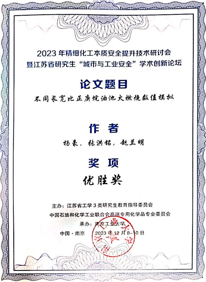 论坛聚焦精细化工、公共安全等方向面临的挑战及机遇深入探讨,共谋“产才融合”目标下的化工安全科技发展。我院由张兰君老师指导,研究生许宇龙负责的《有机硫对煤自燃的影响及其作用机理研究》在江苏省研究生“城市与工业安全”学术创新论坛荣获三等奖,并作了口头汇报,由赵兰明、张洪铭两位老师指导,研究生杨豪负责的《不同长宽比正庚烷油池火燃烧数值模拟》荣获优胜奖。